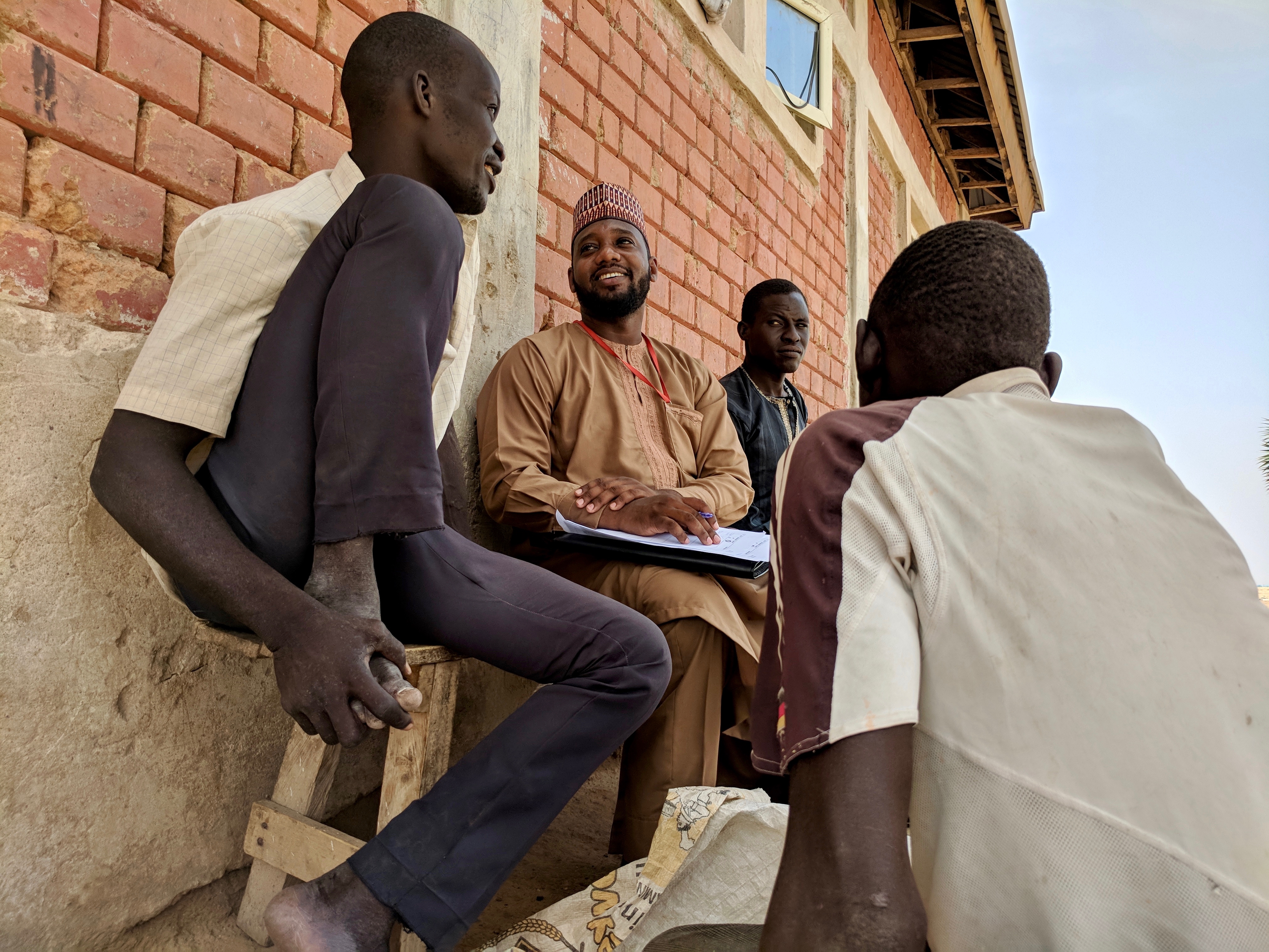 Yahaya (center left), TWB Kanuri Team Leader, conducts research on how well words like “stress” and “abuse” are understood in Kanuri and whether words like “rape” and “mental health” carry a stigma. Internally displaced people’s camp, Maiduguri, Borno State, Nigeria.